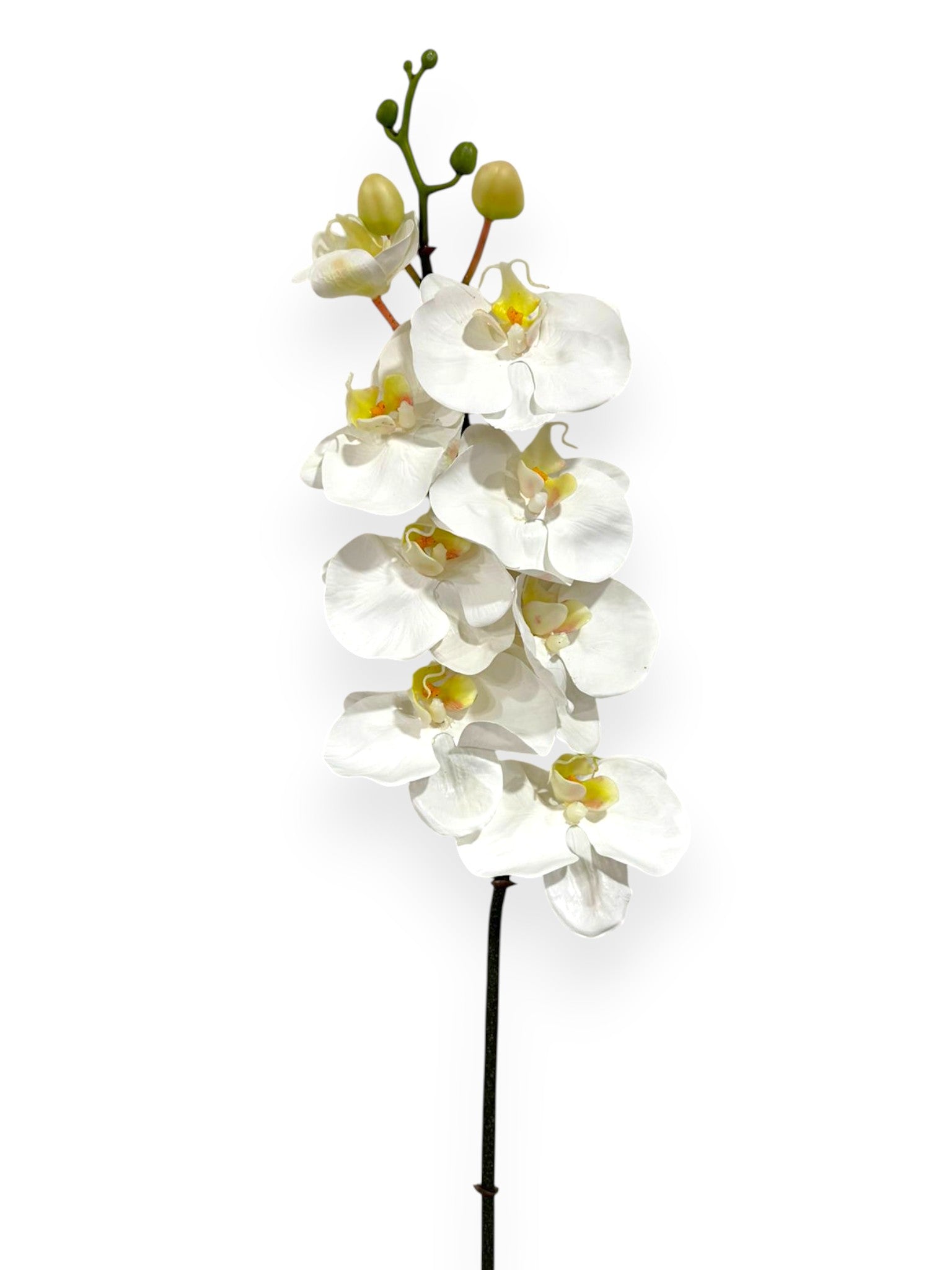 Bring luxurious beauty and timeless elegance to your floral designs with this stunning Phalaenopsis Orchid Stem. Featuring eight lifelike white orchid blooms accented with soft yellow centers and three realistic buds, this piece offers graceful movement and a sophisticated, high-end look perfect for upscale arrangements.